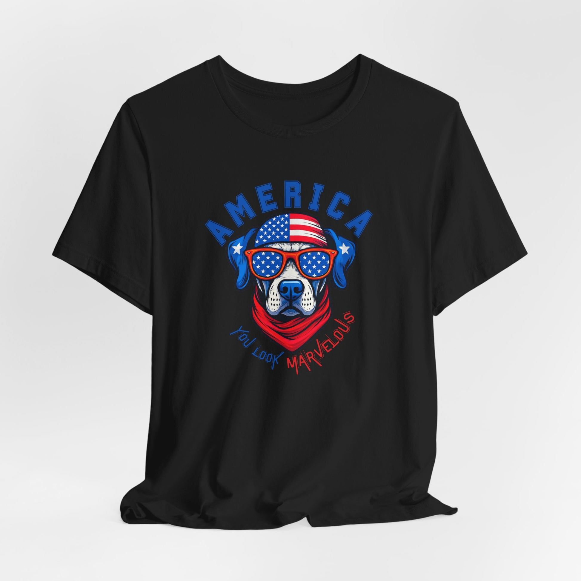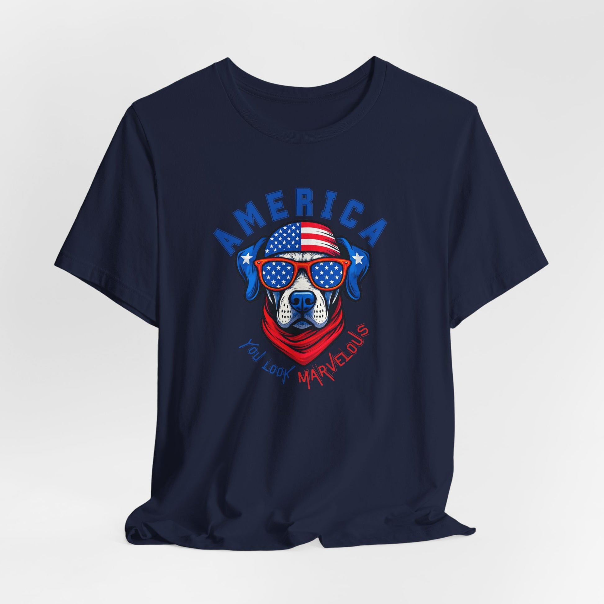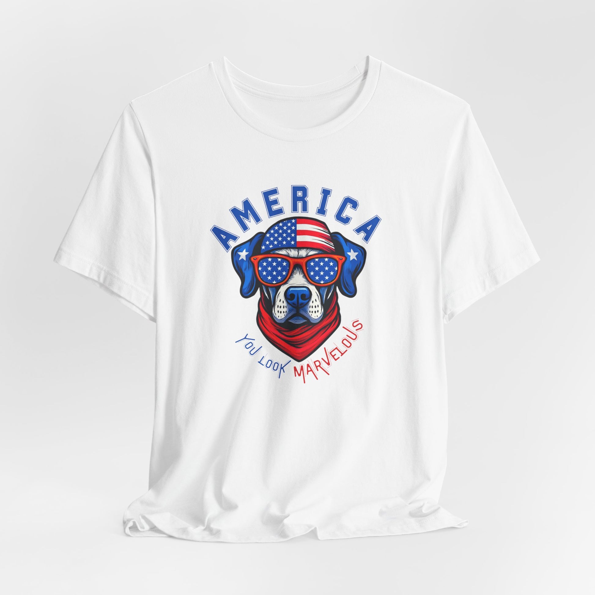 Introducing our versatile Unisex Jersey Short Sleeve Tee, designed for comfort and style. This tee brings a fun, patriotic vibe with its playful graphic featuring a stylish dog wearing sunglasses adorned with the American flag. It's perfect for celebrating holidays like the Fourth of July, Memorial Day, or any casual get-together where you want to stand out. Ideal for dog lovers and anyone who appreciates quirky, light-hearted fashion, this shirt can easily be dressed up or kept casual. Pair it with shorts for a summer picnic or layer it under a jacket for cooler evenings. This tee is made for those who value both style and comfort in their wardrobe.