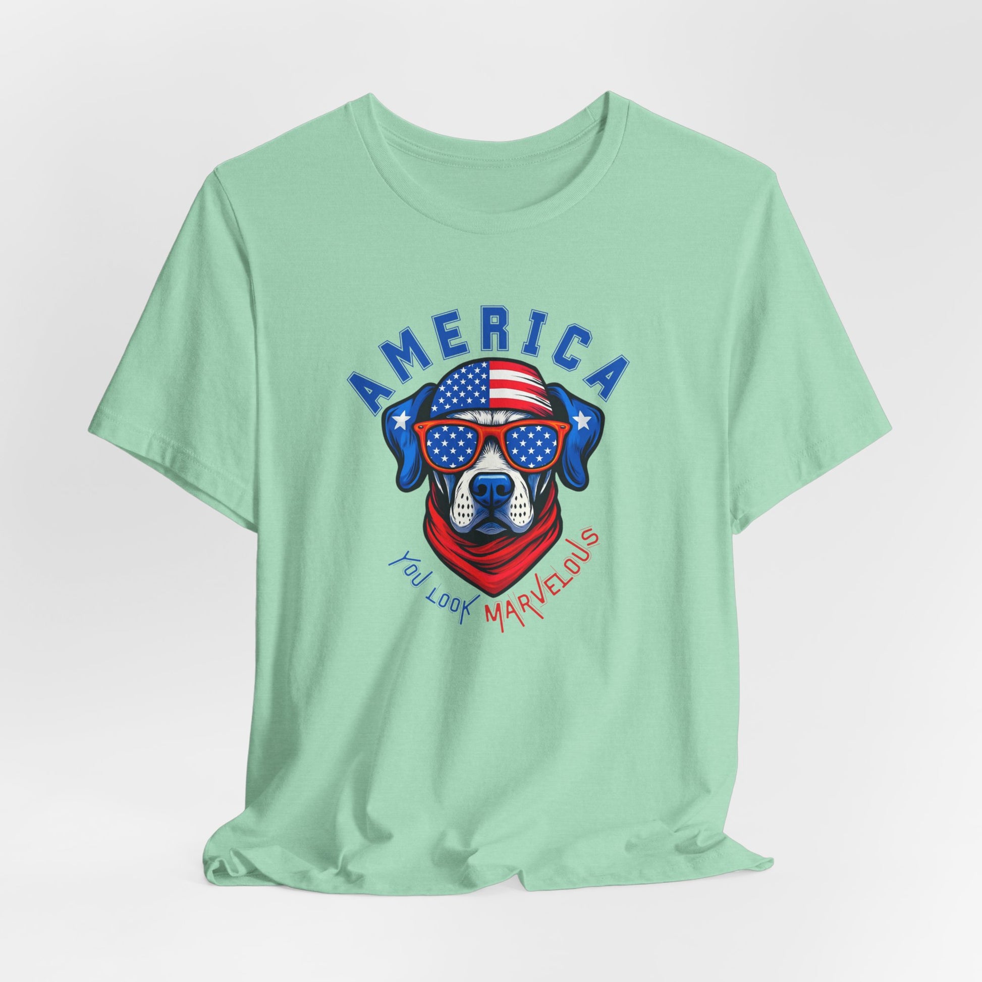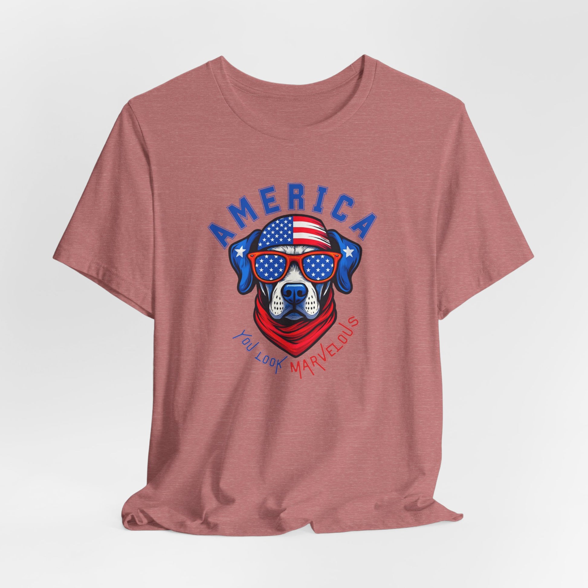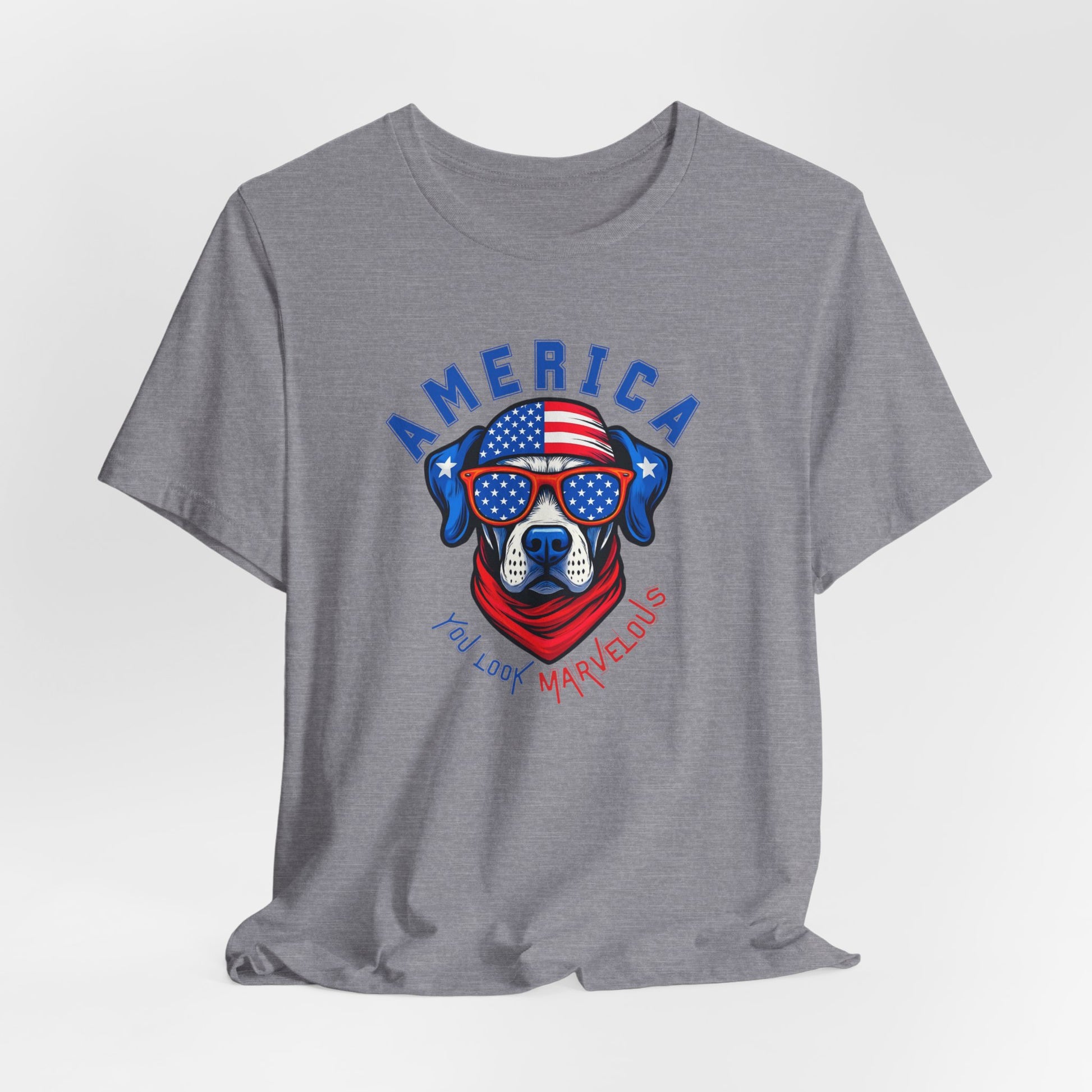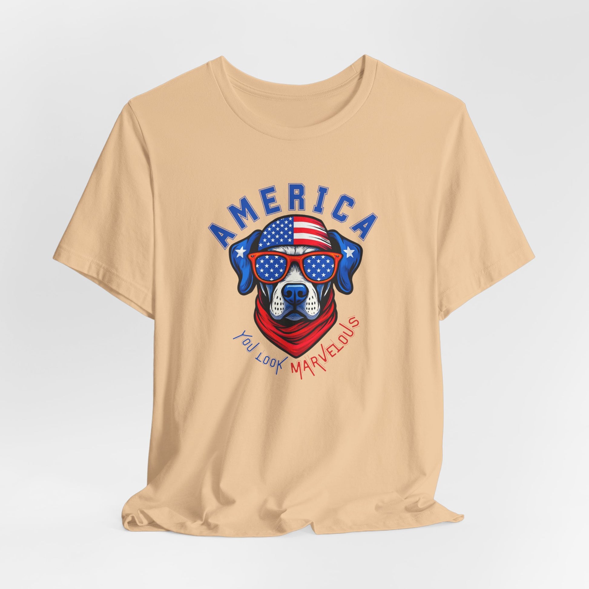 Introducing our versatile Unisex Jersey Short Sleeve Tee, designed for comfort and style. This tee brings a fun, patriotic vibe with its playful graphic featuring a stylish dog wearing sunglasses adorned with the American flag. It's perfect for celebrating holidays like the Fourth of July, Memorial Day, or any casual get-together where you want to stand out. Ideal for dog lovers and anyone who appreciates quirky, light-hearted fashion, this shirt can easily be dressed up or kept casual. Pair it with shorts for a summer picnic or layer it under a jacket for cooler evenings. This tee is made for those who value both style and comfort in their wardrobe.