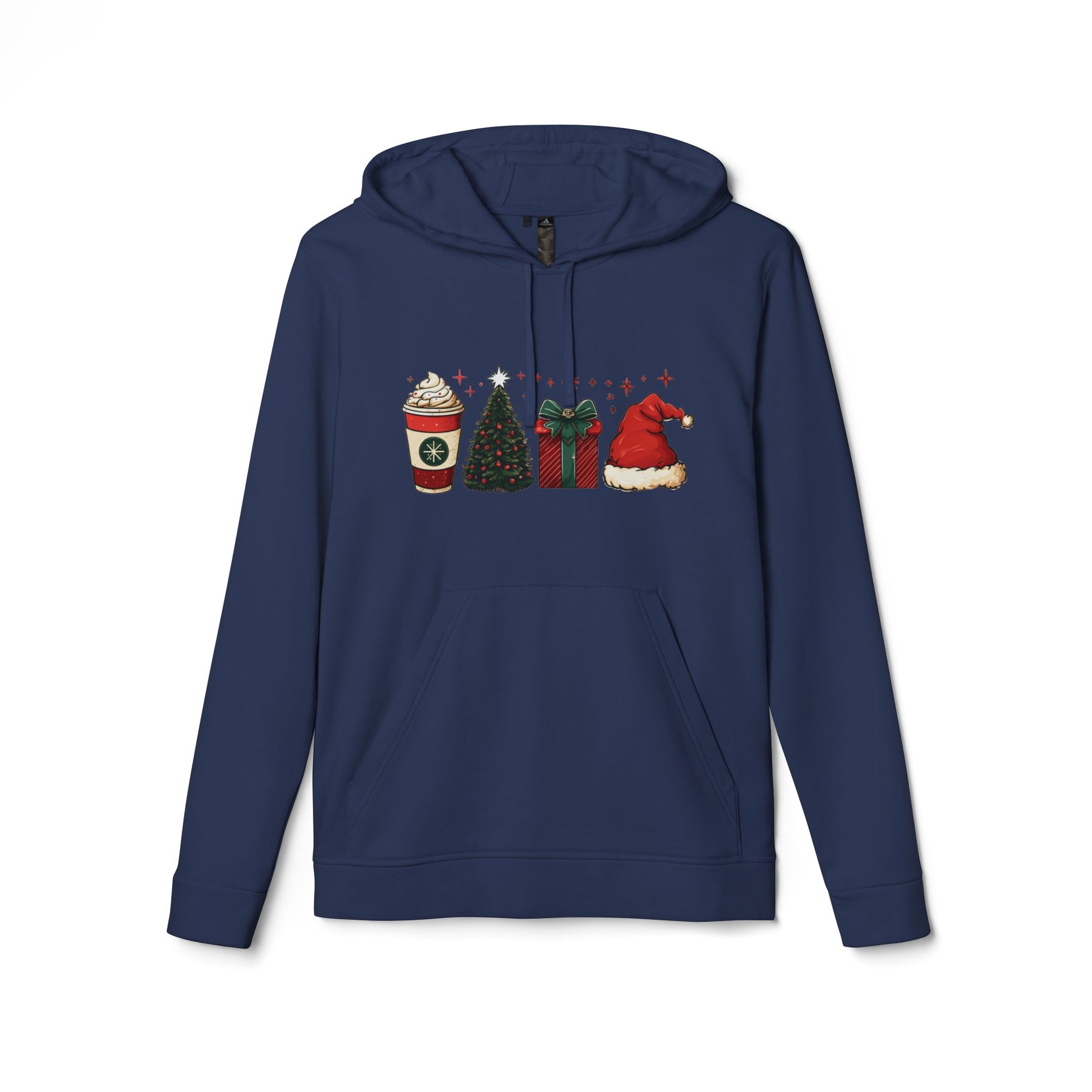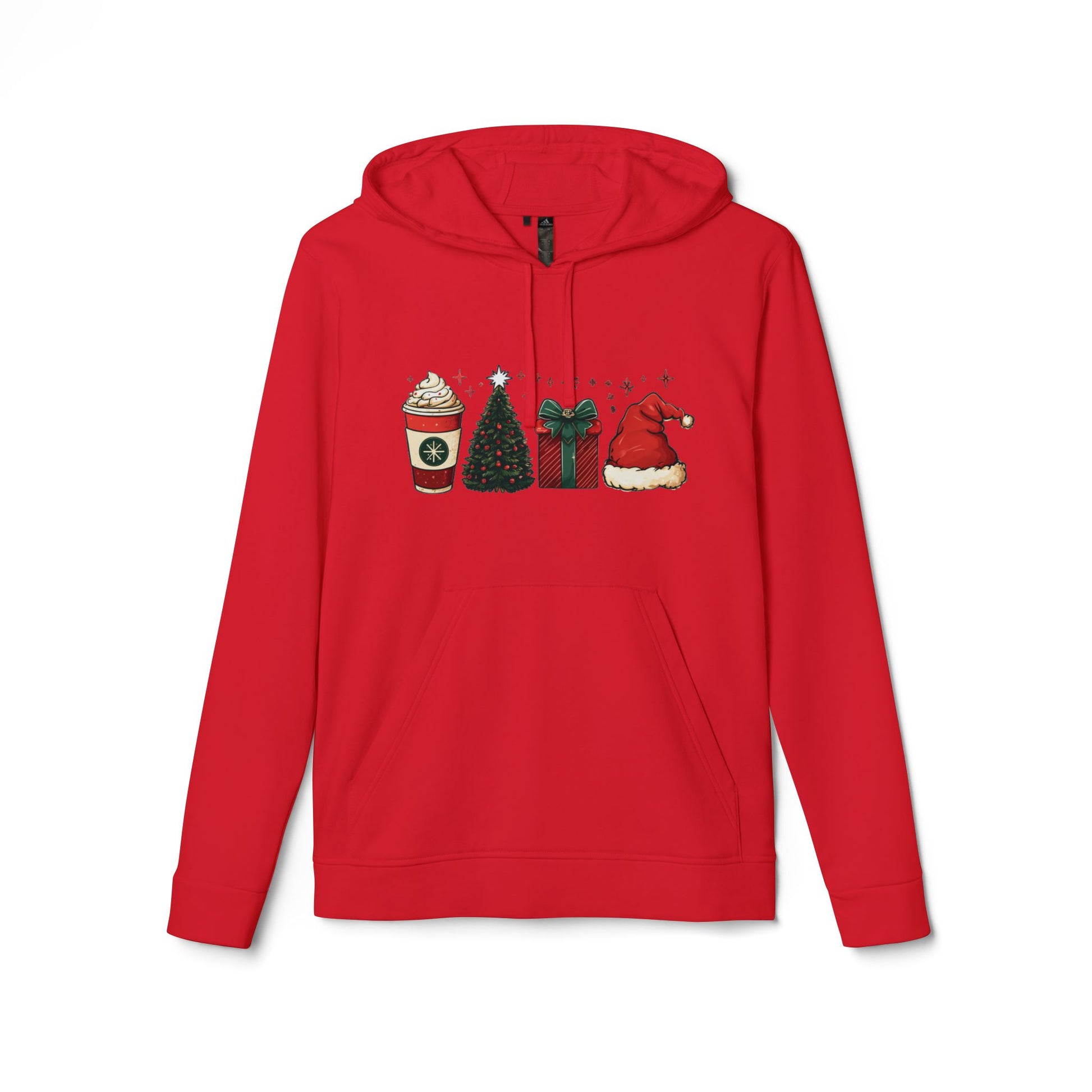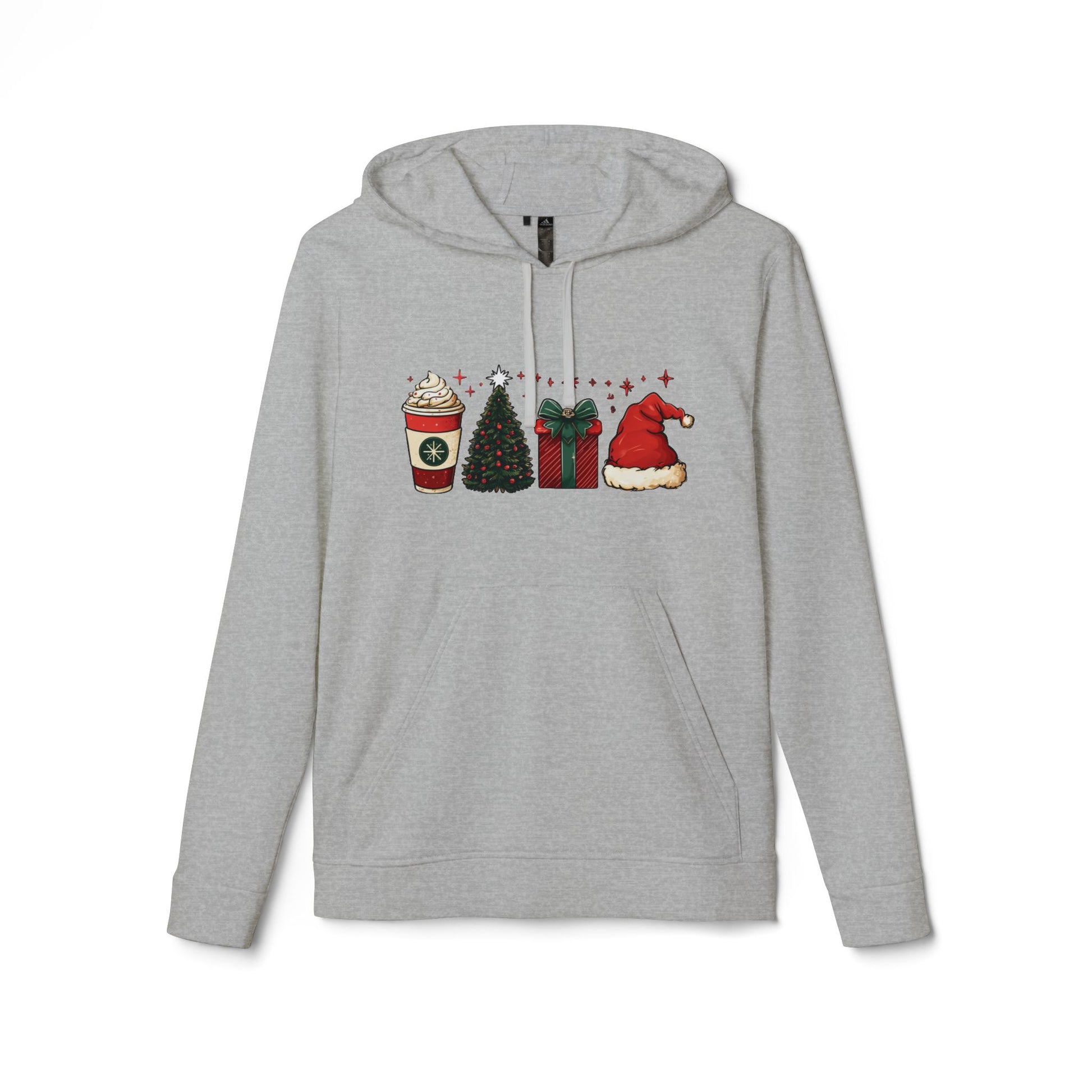 A warm, festive hoodie that brings cozy holiday moments into everyday wear. Soft, mid-weight fleece with a subtle row of seasonal icons — a spiced latte, twinkling tree, wrapped present, and a plush Santa hat — printed across the chest. The adjustable hood and kangaroo pocket invite chilly walks and quick coffee runs, while cuffed sleeves and a stabilized necktape keep the fit feeling lived-in but neat. Clean white fabric makes the cheerful design pop and keeps the vibe fresh for holiday gatherings, winter markets, or slow mornings at home.